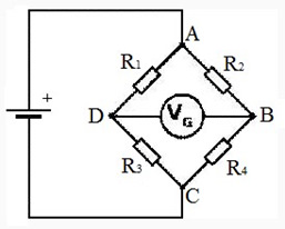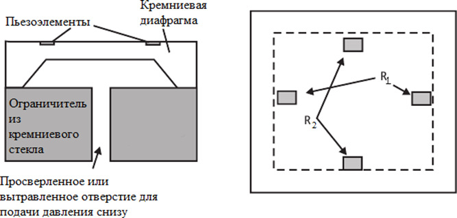 Резисторы, расположенные по краям диафрагмы, ориентированы в одном направлении. Таким образом два резистора ориентированы перпендикулярно (R2) максимальной деформации, они испытывают напряжение растяжения и увеличивают значение сопротивления с увеличением давления, а два (R1) – параллельно, они испытывают напряжение сжатия и уменьшают значение сопротивления с увеличением давления. Реакция резисторов на давление зависит от ориентации пластины и диафрагмы, от количества легированной примеси, от температуры. Более высокой чувствительности можно добиться включение резисторов в мост Уитстона (рис. 4).